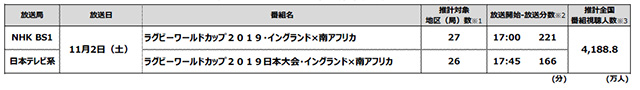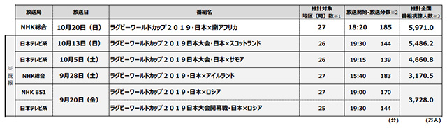 ビデオリサーチ、ラグビーW杯・日本戦5試合の全国視聴人数を推計