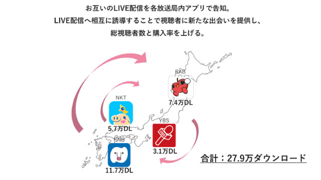 またデジタルの強みである「だれでも・どこでも・いつでもアクセス可能」である特徴を最大限に生かして、各エリアの放送局を横断した取り組みも実施しいていく。放送局は、LIVEコマースをテレビ放送枠や、各デジタルメディアを活用して告知し、自局アプリへのダウンロードを促進。各放送局へのLIVE配信へアプリからお互い誘導し合うことで、視聴数の増加から収益の最大化を狙う。さらにLIVE配信においては動画でサイト上にアーカイブ化することでLIVE配信だけではなく、アーカイブからの購入も狙うという。
