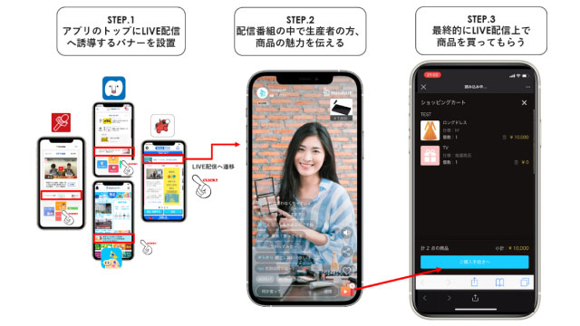 LIVE配信では、実際に商品を生産している人が出演し、商品に対する思い(こだわり)を視聴者に伝えていく。視聴者と双方向にコミュニケーションをとりながら機能的な価値だけでなく、情緒的な価値も含めて商品を訴求していき、その配信を見ながら視聴者は商品を購入してもらうという仕組みだ。