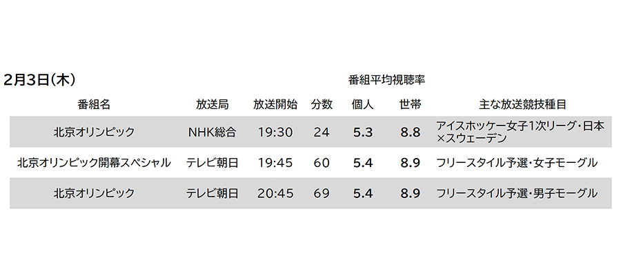 ビデオリサーチ『北京オリンピック』2月3日の主な関連番組視聴率を発表