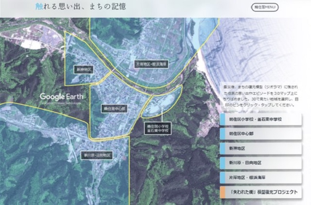 サイトでは、「釜石の出来事」や「ラグビーW杯」など「鵜住居」にまつわる記憶をデジタルで再構成。資料へのリンクや3D映像を多用し、11年前の震災を自分ゴトとして追体験してもらえるような工夫が施されている。また震災前のまちの復元ジオラマに手書きで残された「住民の思い出」を、デジタル化して3Dマップに収録。自在に動く3Dの地図上で目印のピンをクリックすると、「思い出」がポップアップしてテキスト表示されるなどインタラクティブなコンテンツづくりにもこだわったという。3DなどのデジタルコンテンツおよびWEBサイトはIBCが自社内で制作。震災前の3Dマップは、記者が母校の鵜住居小学校で行った授業でも教材として活用された。