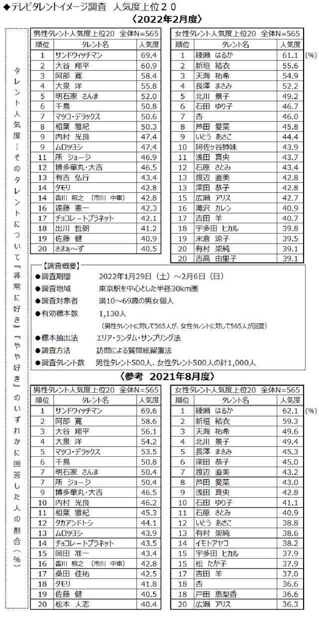 “リアル二刀流”「大谷翔平」が2位に躍進!ビデオリサーチが「テレビタレントイメージ2022年2月度調査」結果を発表
