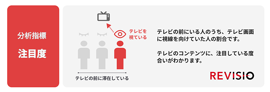 「REVISIO株式会社」(よみ:リビジオ)では、テレビの前にいる人のうち、テレビ画面にくぎづけになっていた(視線を向けていた)人の割合がわかる「注目度」を用いて、「個人全体」ならびにREVISIOで定義した「コア視聴層(男女13歳~49歳)」のテレビ番組ランキングを公開している。