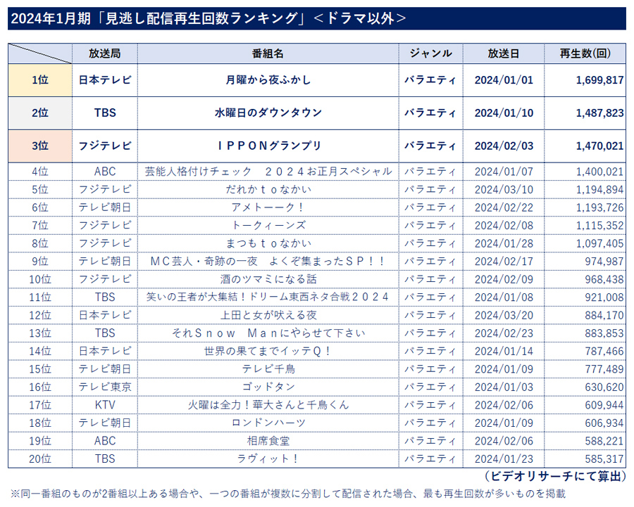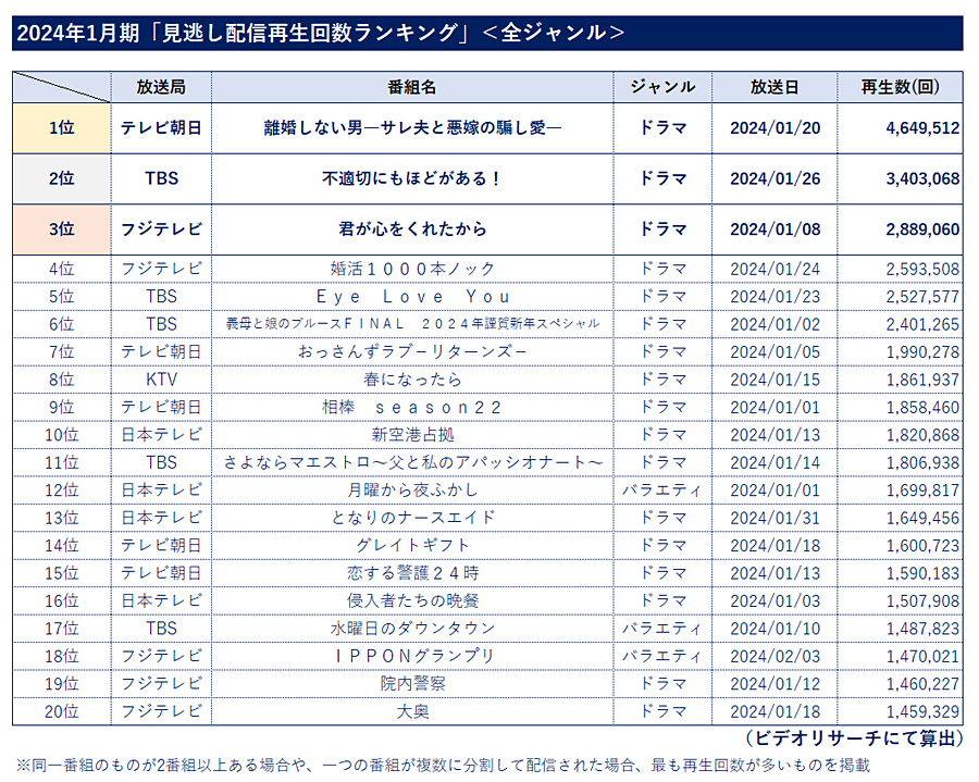 24年1月期「見逃し配信」再生回数ランキング!全ジャンル1位は『離婚しない男』、ドラマ以外では『月曜から夜ふかし』が1位