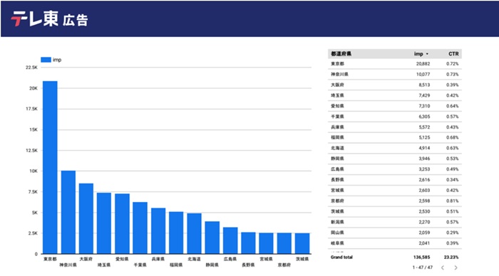 広告視聴者の居住地域が都道府県区分で把握できる。
