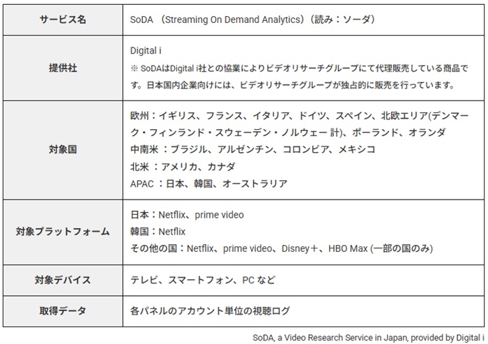 「SoDA」はイギリスの調査会社であるDIGITAL-I LIMITED(Address:470 Bath Road,Arnos Vale,Bristol,England, BS4 3AP、Founder and Chairman:Ali Vahdati、以下、Digital i)の提供する商品で、日本国内企業向け販売については、ビデオリサーチが独占代理販売契約を締結し、国内で唯一の提供窓口となる。