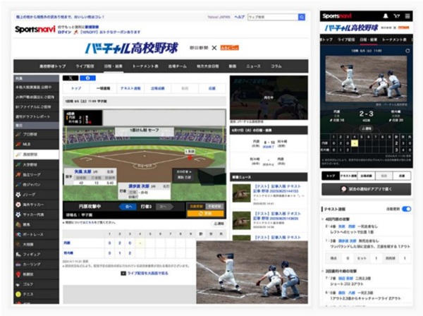 「スポーツナビ」の「バーチャル高校野球」では、試合映像と合わせて試合のスコア、一球ごとの詳細情報(パソコン版と「スポナビ 野球速報」アプリのみ)、選手情報といった各種データを同時に楽しめる。また、応援コメントも投稿でき、同時に視聴しているファンのメッセージと合わせて、一緒に応援しているような雰囲気を味わえる。