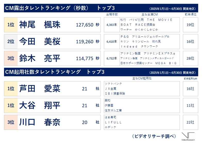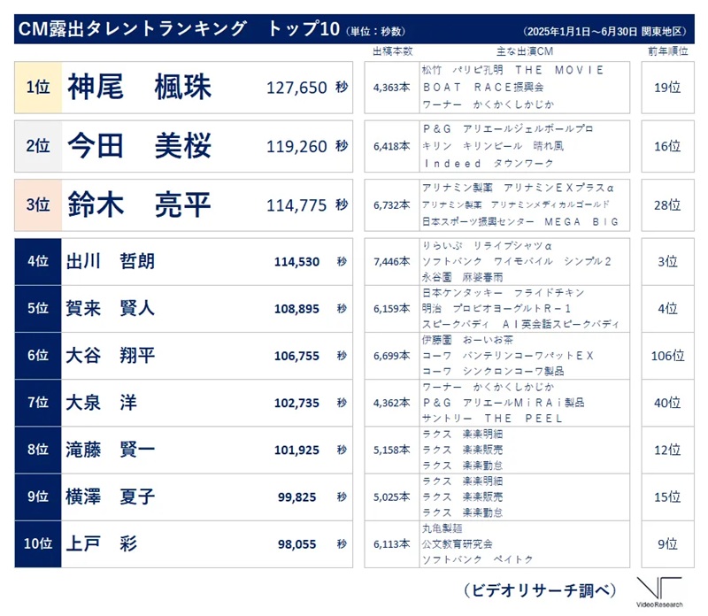 ビデオリサーチ、上半期CM露出タレントランキングを発表 神尾楓珠が1位!起用社数は芦田愛菜と大谷翔平が1位