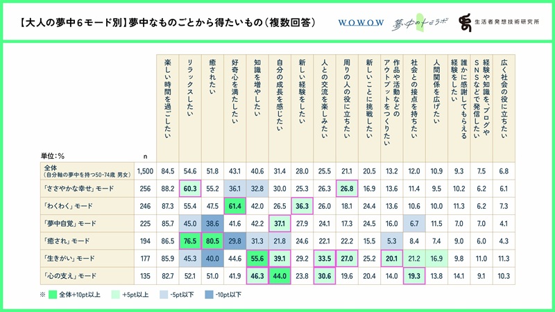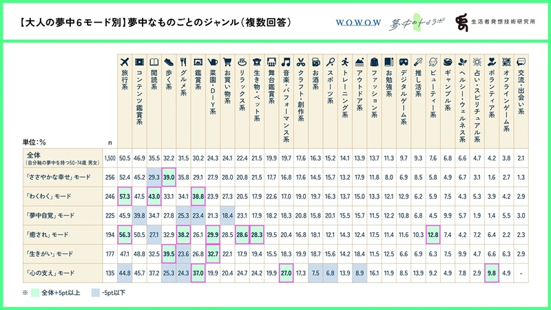 2.自分軸の夢中を持つ50–70代の間には、好きの感じ方によって夢中のあり方が異なる6つの「大人の夢中モード」が存在する