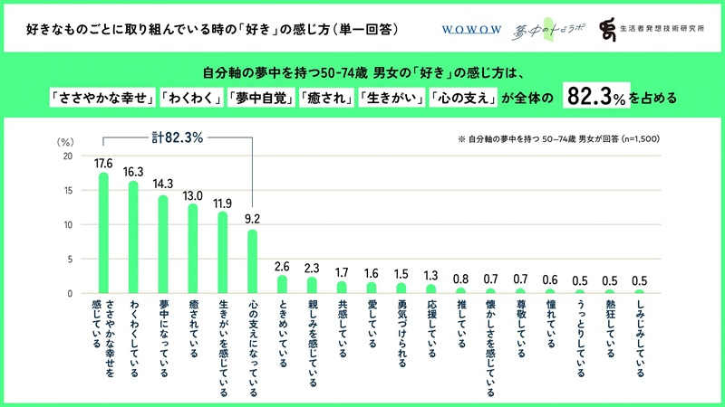 ・自分軸の夢中を持つ50-74歳 男女に、「好きの感じ方」を19種類の項目で聴取したところ、回答は上位6項目「ささやかな幸せ(17.6%)」「わくわく(16.3%)」「夢中自覚(14.3%)」「癒され(13.0%)」「生きがい(11.9%)」「心の支え(9.2%)」に集中し、それらの合計が全体の82.3%を占めた。
