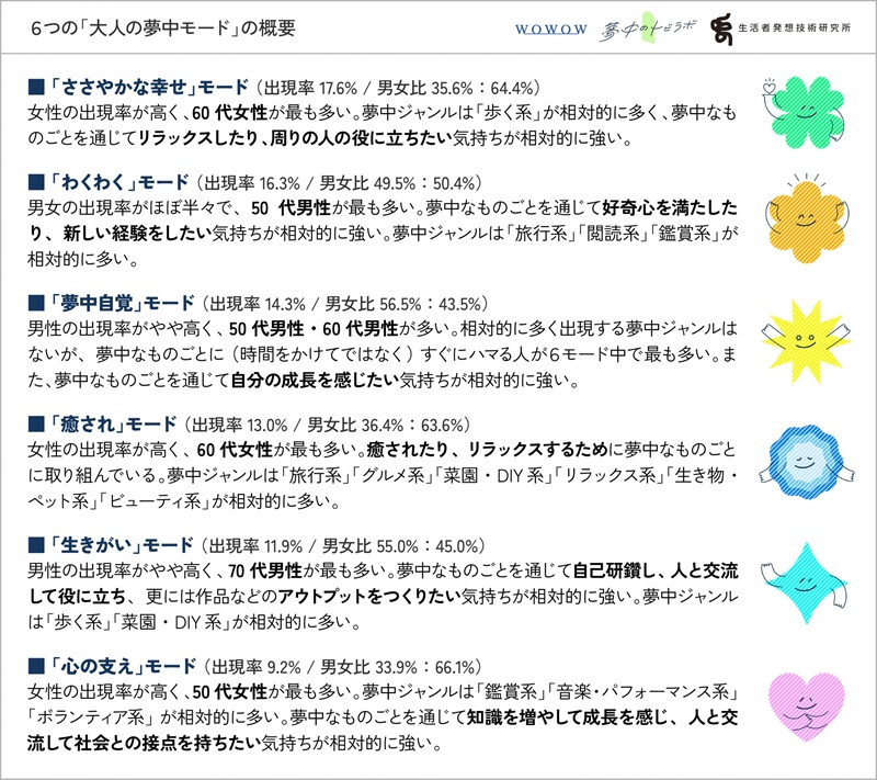 ■サマリー2:自分軸の夢中を持つ50–70代の間には、好きの感じ方によって夢中のあり方が異なる6つの「大人の夢中モード」が存在する