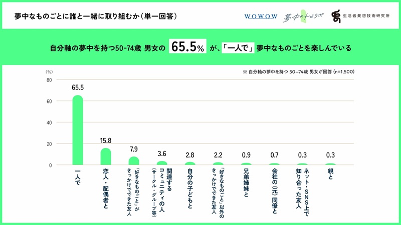 ・自分軸の夢中を持つ50–74歳 男女の65.5%が、「一人で」夢中なものごとを楽しんでいる。