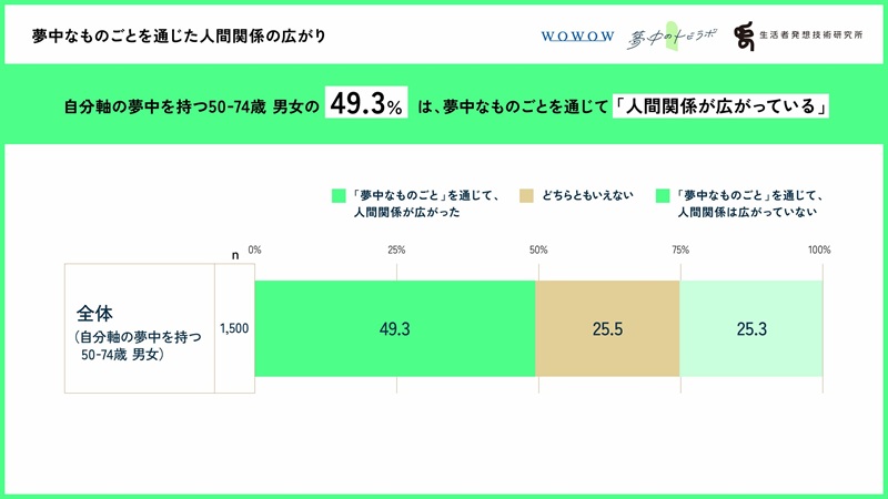 ・自分軸の夢中を持つ50–74歳 男女の49.3%が、夢中なものごとを通じて「人間関係が広がった」と回答。「どちらともいえない(25.5%)」「人間関係は広がっていない(25.3%)」それぞれの約2倍のスコア。