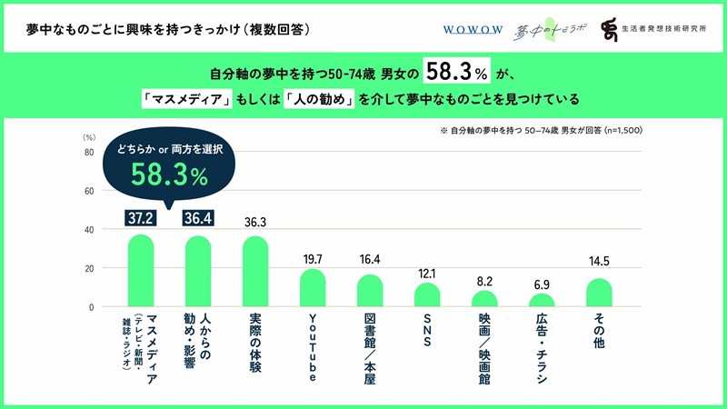 1.自分軸の夢中を持つ50–70代の58.3%が、「マスメディア」や「人の勧め」を介した偶然の出会いから夢中なものごとを見つけている