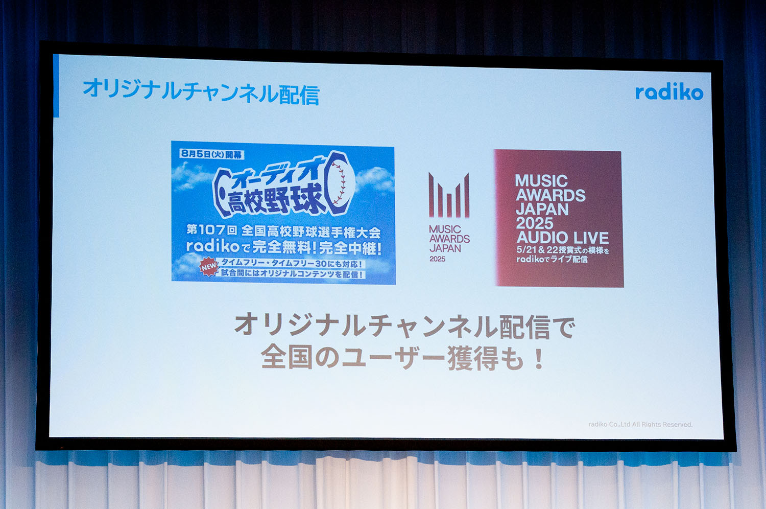 「ABCラジオ協力のもと高校野球全試合を配信した『オーディオ高校野球』や、『MUSIC AWARDS JAPAN』のライブ配信といった『radikoオリジナルチャンネル』の取り組みも新規ユーザー獲得に貢献した」
