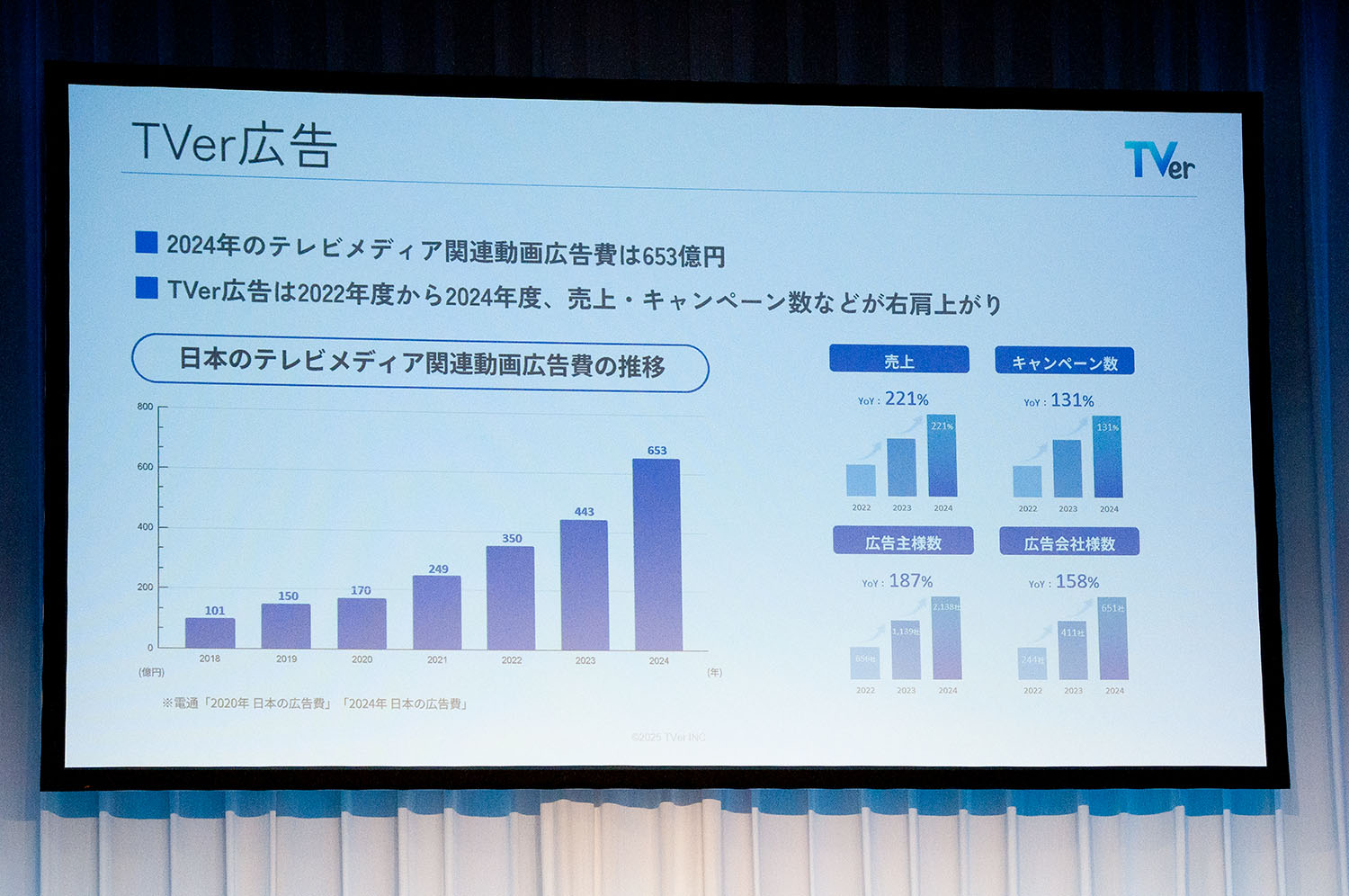 TVer・大場氏は、電通の「2024年 日本の広告費」においてテレビメディア関連動画広告費が653億円という市場規模に伸長した点を踏まえ、「早期に1000億、2000億を目指し、その先には3000億、4000億の市場を創出していく」と壮大な目標を宣言。「MAUを7500万に増やし、視聴頻度と広告単価を倍にすれば達成できる計算」とし、「そのためにTVerはテクノロジーの役割を全うする」と力を込めた。
