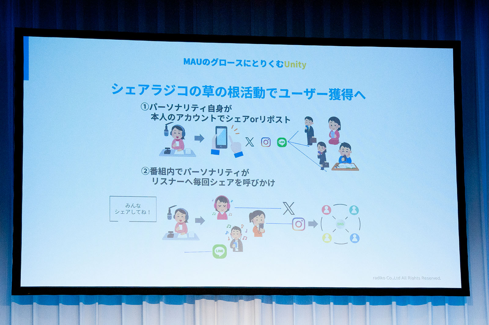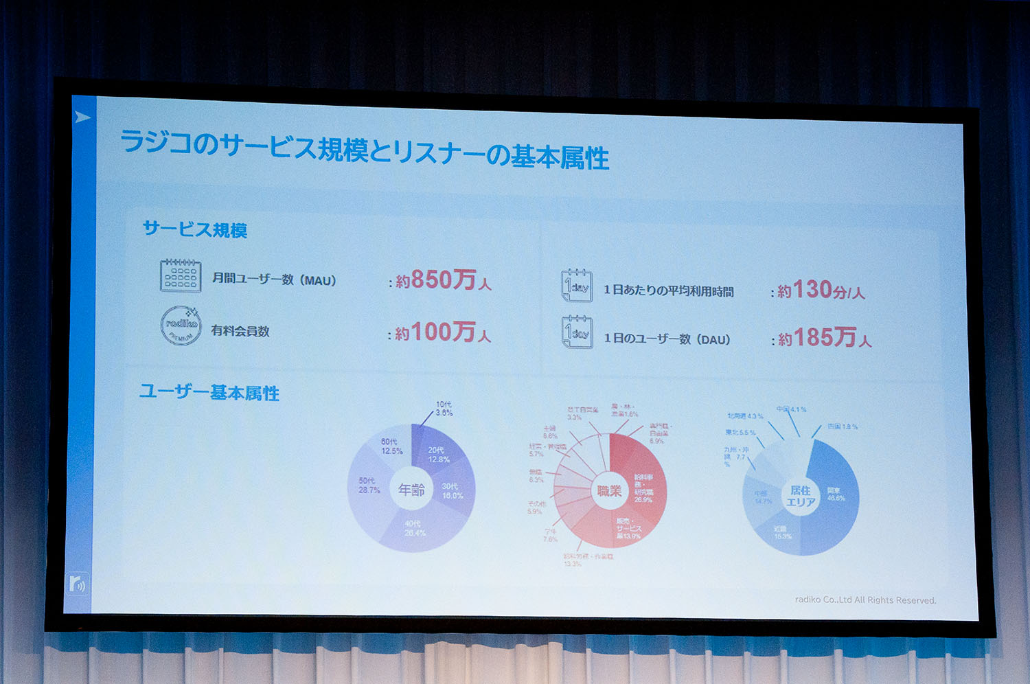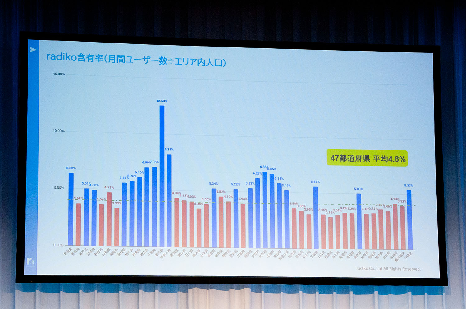 「現在、含有率が最も高い東京でも12.53%、全国平均では4.8%に留まっている」と池田氏。「この数字を全都道府県で20%まで引き上げられれば、1000万ユーザーは余裕で見えてくる」とし、「『Unity』の精神で各地域の放送局と一体となり、どんなユーザーにradikoがフィットするのかを把握しながら進めたい」と語った。