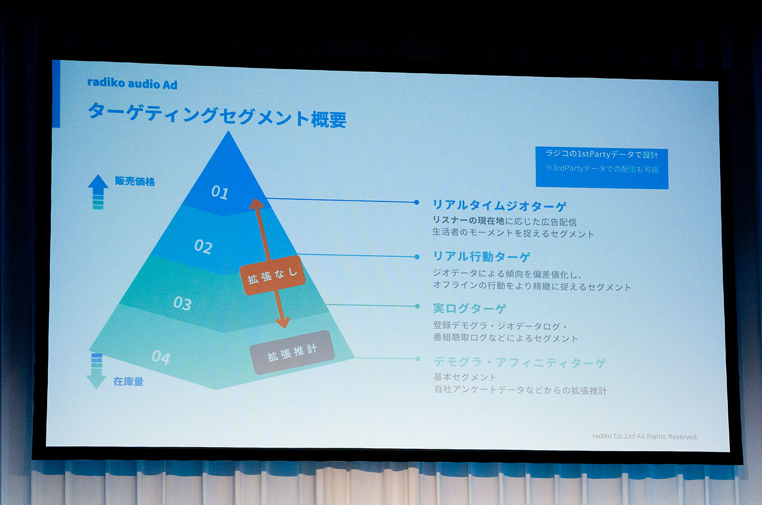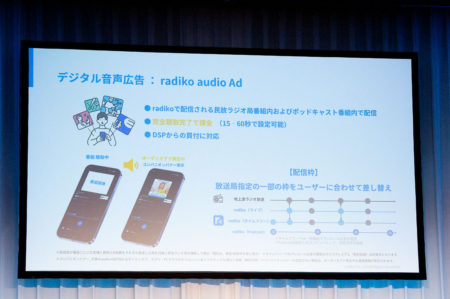 さらに池田氏は「まだ構想段階」としつつ、タイムフリー聴取時におけるプリロール枠での動画広告について言及。「基本的にラジオ聴取中は画面を見ないが、再生開始の操作を行う際など、画面を見る必要があるタイミングで広告を流し、認知してもらうという方法もある」と、新たな可能性にも言及した。