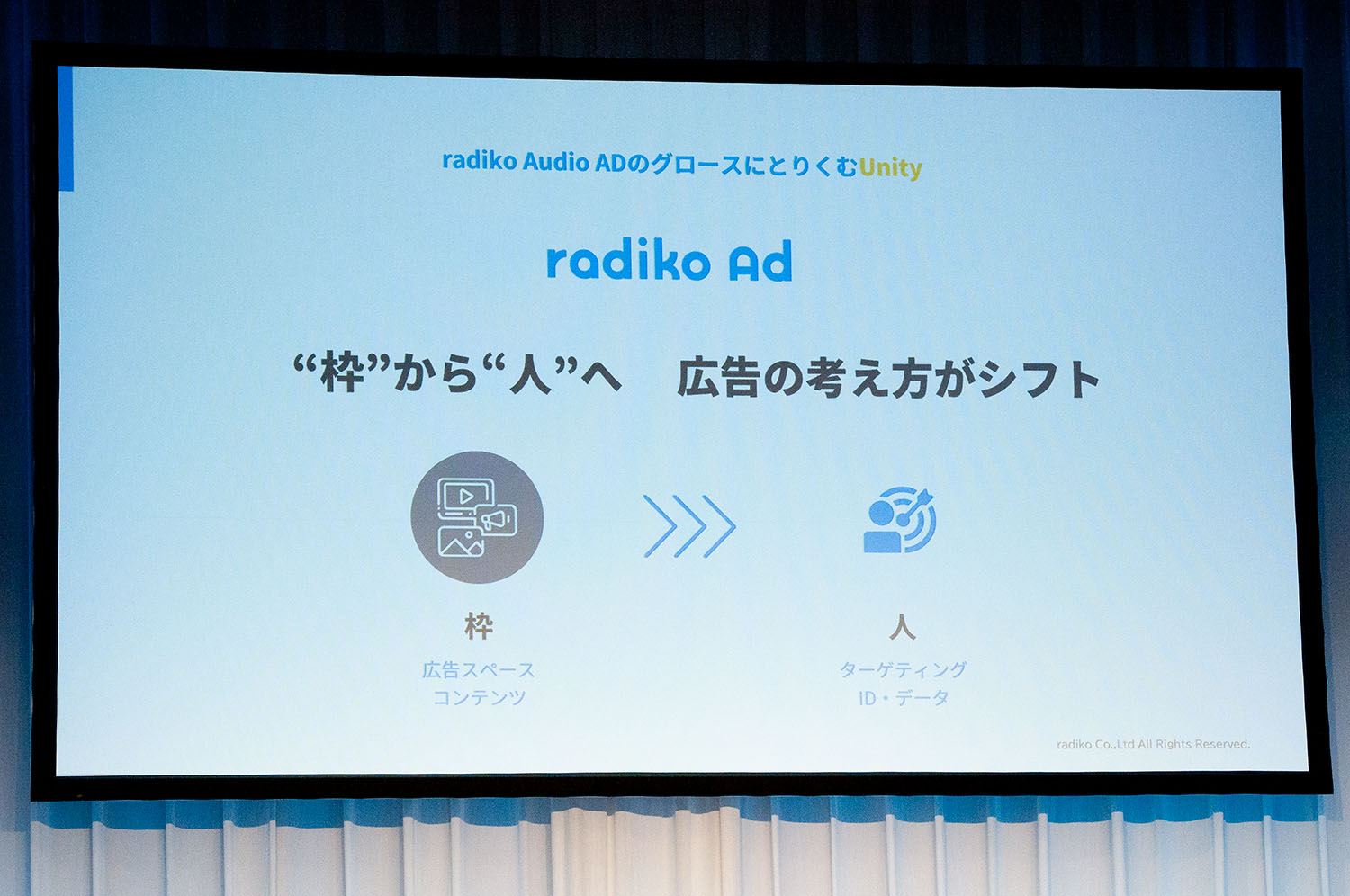 広告価値の向上について、radiko・池田氏は「枠(広告スペース・コンテンツ)から人(ターゲティング・ID・データ)へ」という考え方のシフトを体現するターゲティング広告「radikoオーディオアド」を紹介。