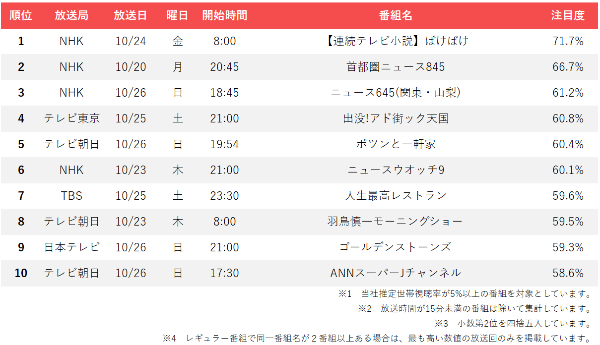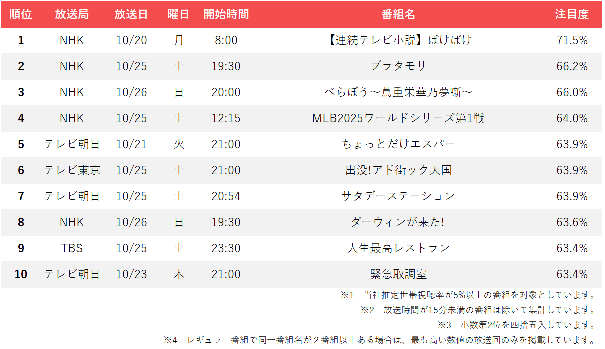 一方、海外スポーツでは、大谷翔平選手らが所属するドジャースが出場する「MLB2025ワールドシリーズ」が10月25日(日本時間)に開幕した。NHKで放送された『ワールドシリーズ第1戦』は個人全体で4位(注目度64.0%)にランクインしており、この歴史的な対戦への期待が、関連ニュースやスポーツコーナーを含む報道番組全体の注目度を押し上げる一因となった。