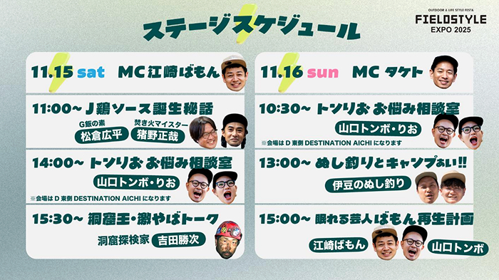「ハピキャンステーション」と「DESTINATION AICHI」では、2日間にわたり人気キャスパーや専門家によるトークステージを開催する。アウトドアの楽しみ方や、とっておきの情報が聞けるチャンスとなる。
