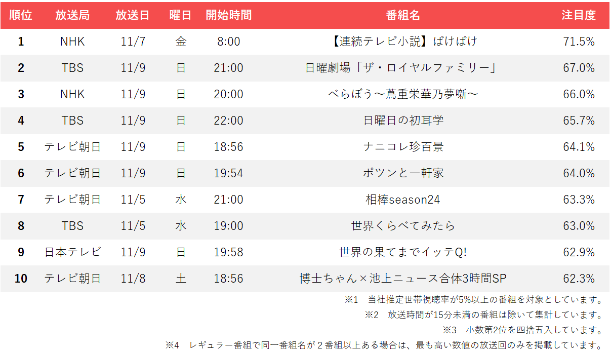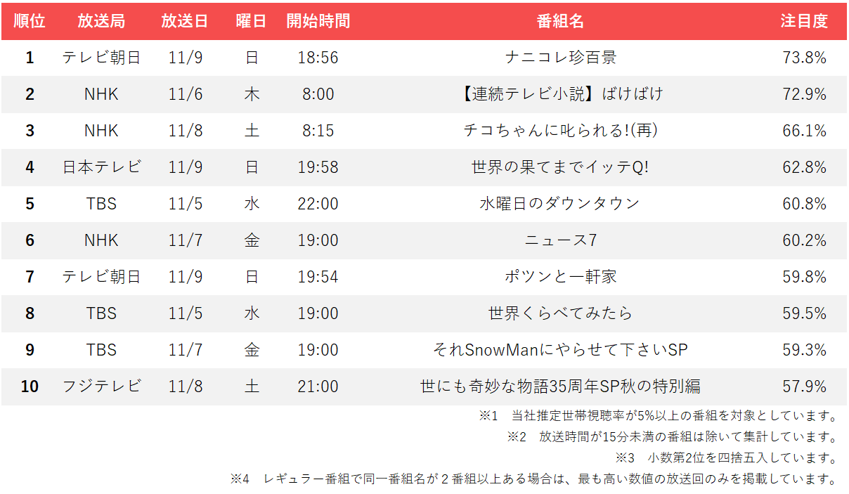 11月第2週の注目度ランキングでは、バラエティ番組が複数上位にランクインする結果となった。コア視聴層で「ナニコレ珍百景」が73.8%という高い注目度を記録したのを筆頭に、定番バラエティから特別企画まで幅広い番組が視聴者の関心を集めている。