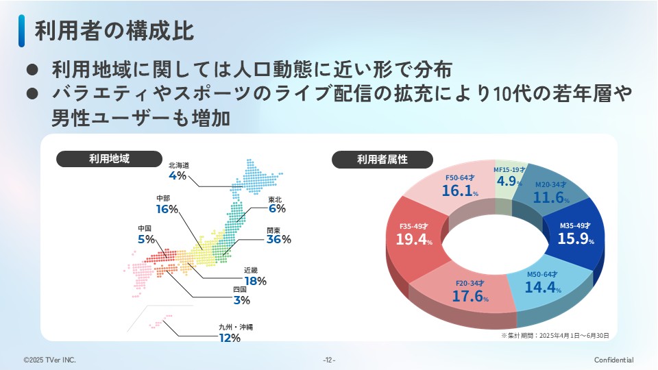 「TVerのデモグラフィックは、非常にバランスのとれた円グラフになっている。利用地域も全国に広がり、ほぼ人口動態に近い形で利用されるプラットフォームへと進化した」