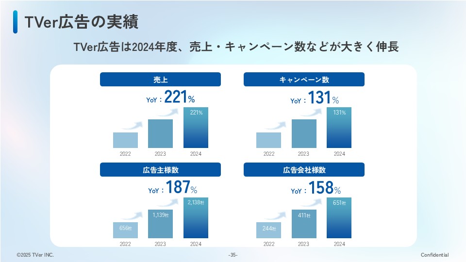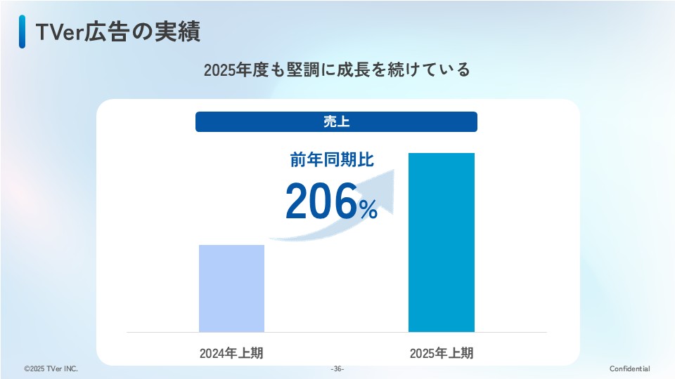 TVer広告の2024年度実績は、売上高で前年比221%増、広告主数は前年比187%増の2138社に達するなど、市場全体の成長率を大きく上回る躍進を遂げた。2025年度についても堅調に成長しており、上半期の時点で昨年同時期比206%の成果を上げている。