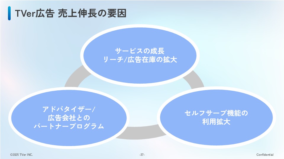 急成長の要因について増村氏は、「TVerサービス自体の成長によるリーチと広告在庫の拡大をベースとしながら、特にパートナープログラムの進化と、広告主が自ら入稿を行える『セルフサーブ機能』の利用拡大が大きく貢献した」と分析。