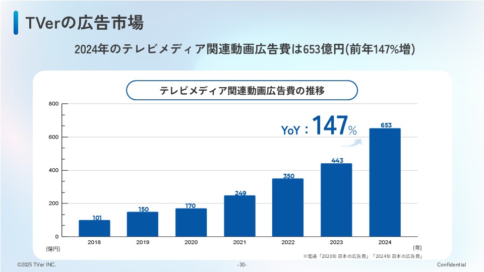電通が発表した「2024年 日本の広告費」によれば、TVerの属する「テレビメディア関連動画広告費」市場は、前年比147%増の653億円に到達。