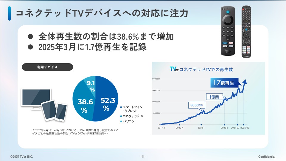 「CTVでの再生割合は全体の38.6%に達し、その成長率は他のデバイスを大きく上回っている。各メーカーのテレビリモコンや『Amazon Fire TV Stick』のリモコンに『TVerボタン』が標準搭載される状況が、その普及を後押ししている」