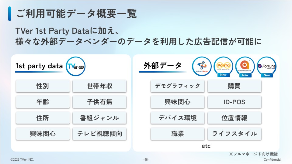 さらに、博報堂DYメディアパートナーズの「AudienceOne」や、Supershipの「Fortuna」とも接続予定。これにより、TVerのファーストパーティデータだけでは実現できなかった、より高度なターゲティングが可能になるという。
