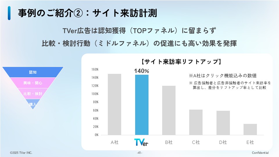 「複数の動画プラットフォームにおけるサイト来訪効果を比較した調査結果では、TVerが他プラットフォームと比較して高いリフトアップを示した」と増村氏。「認知獲得だけでなく、ミドルファネルの促進にも高い効果があることを示せた」とアピールした。