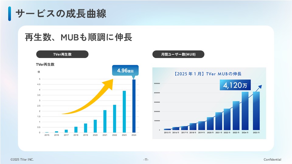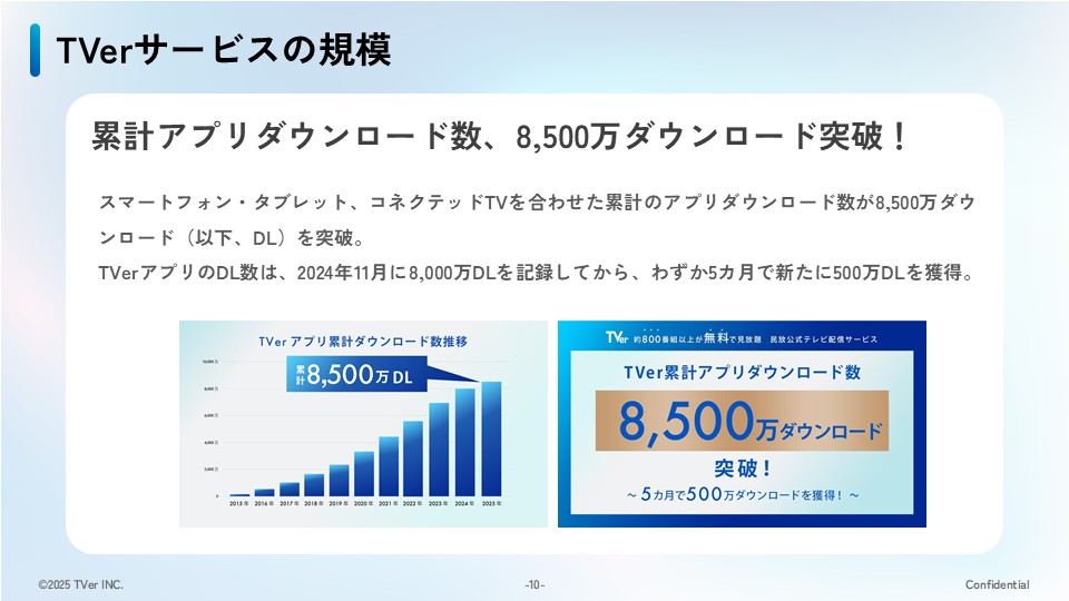 TVerの累計アプリダウンロード数は8500万を突破し、直近5ヶ月で新たに500万増加。再生数やMUB(月間ユーザー数)も右肩上がりの成長を続けている。