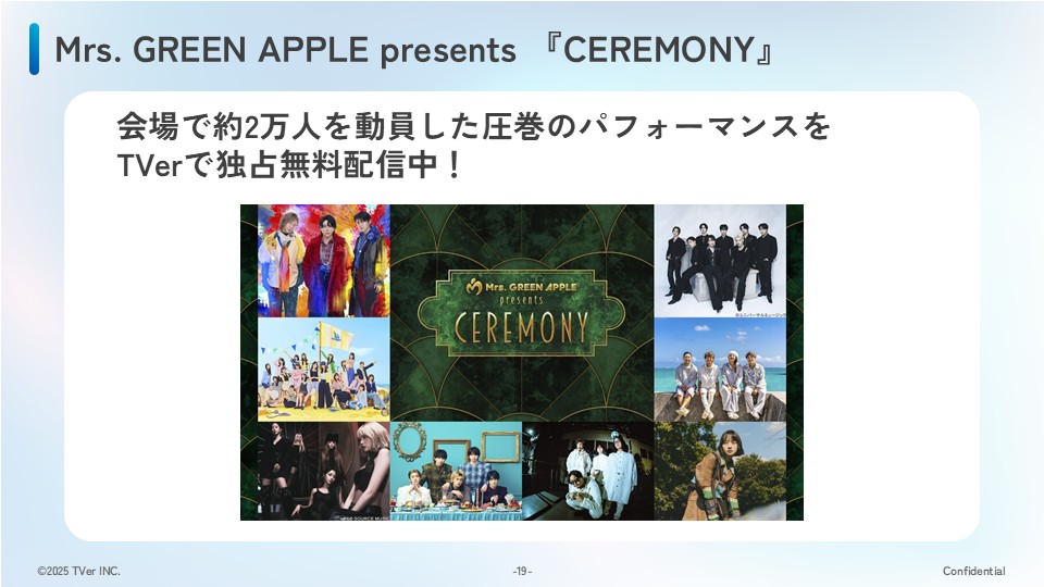 さらに、人気ロックバンド「Mrs. GREEN APPLE」によるエンターテインメントショーのライブ配信を実施し、1年間にわたって独占無料配信を実施。放送局由来のコンテンツ以外にも幅を広げ、新たな視聴シーンの創出に取り組んでいる。