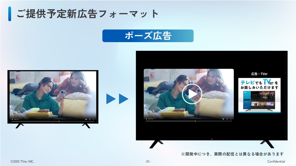 「ポーズ広告」は、ユーザーが本編視聴中に一時停止した際、画面上の空きスペースに広告を表示するもの。「半数以上のユーザーが利用する一時停止機能に着目した新しい試み」と大野氏は述べ、「来年のできるだけ早いタイミングでのリリースを目指している」と語った。
