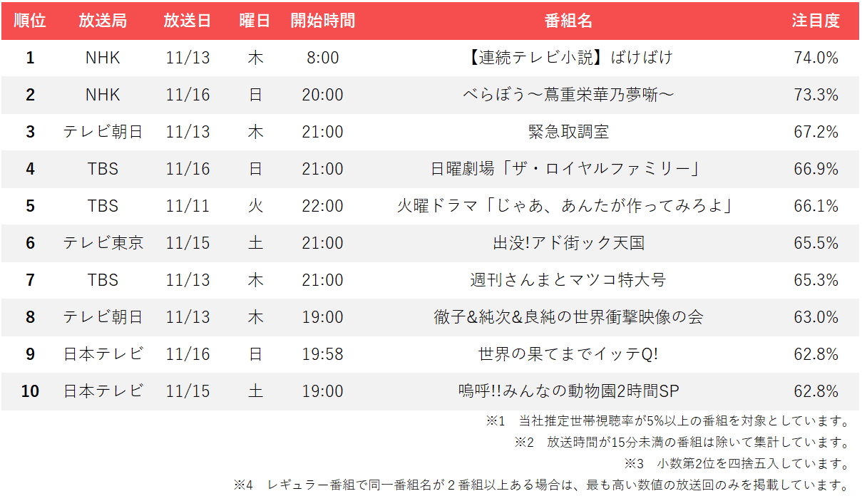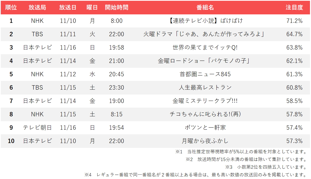 週間テレビ番組注目度ランキング【11月10日(月)~11月16日(日)】