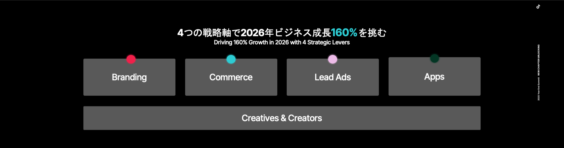 2026年に向けて、TikTok for Businessは、ブランディング、リード獲得、アプリ、eコマースの4つの戦略軸を中心に、クライアントのさらなるビジネス成長を支援する新たなソリューションを順次提供していく。また、メジャーメント領域(効果測定)においては、データクリーンルームなどを活用した測定精度の向上にも取り組んでいく。