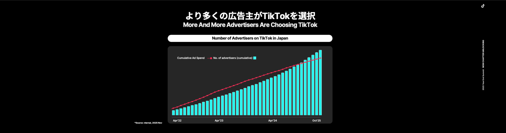 2025年は、本イベントのキーメッセージ「New Chapter Unlocking」が示すとおり、TikTokが日本のユーザーにとって日常的に利用されるプラットフォームとなるべく、ソリューションの提供やアップデートを進め、ユーザー・企業・クリエイターがそれぞれの目的を達成できる“新章”が本格的に始動した一年となった。