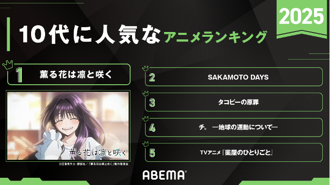 「ABEMA」が10代人気アニメランキング発表!2025年1位は青春群像劇『薫る花は凛と咲く』。『SAKAMOTO DAYS』など人気作がランクイン