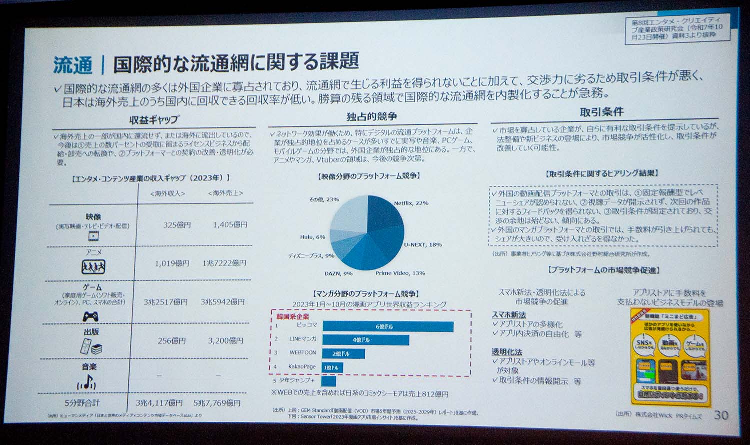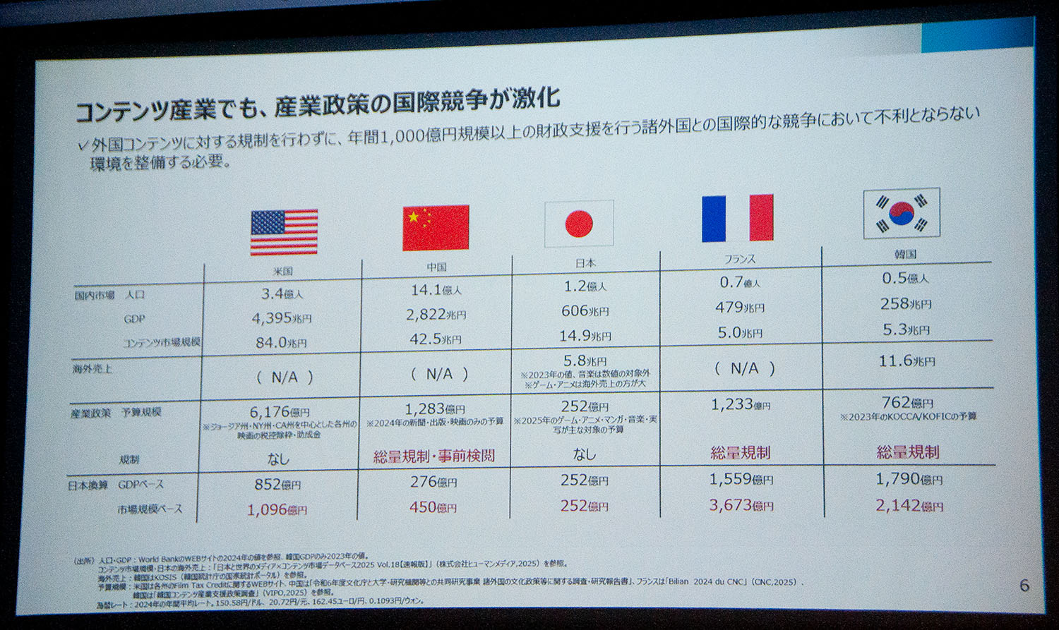 「特に韓国は、GDP比で日本の半分でありながら、コンテンツ関連予算は日本の3倍以上を投じている」と指摘し、日本の競争力を維持・強化するためには、官民が連携した産業政策としてのテコ入れが不可欠であるとの認識を示した。
