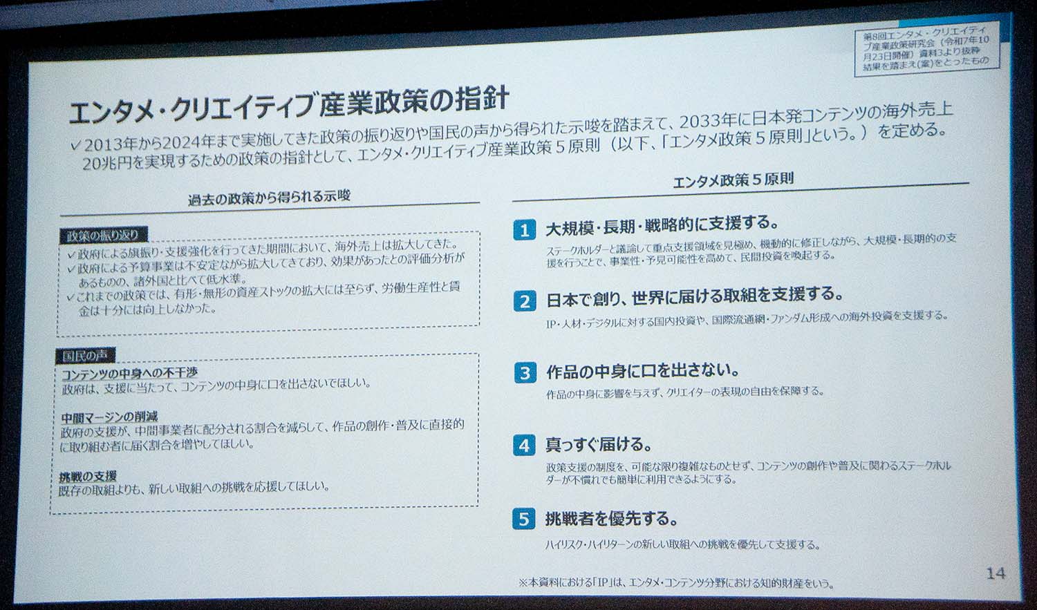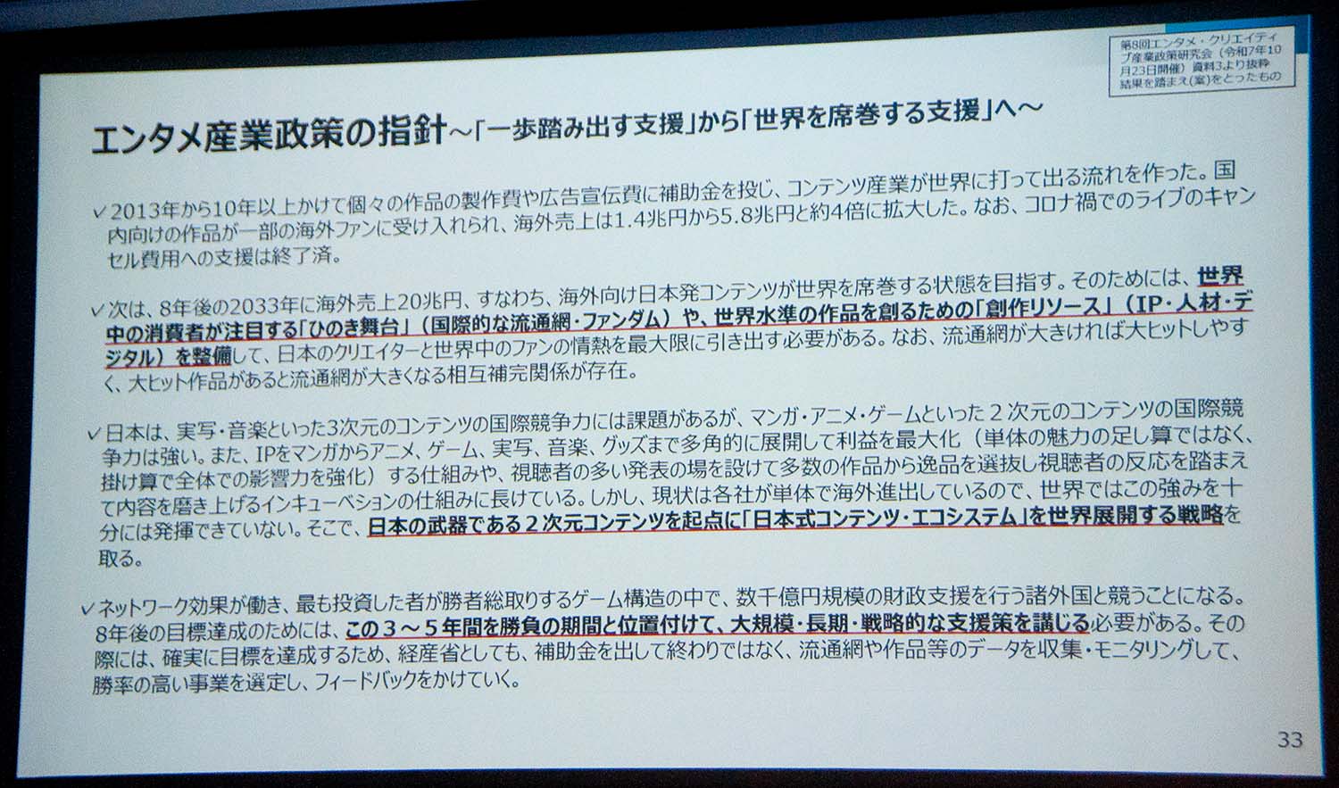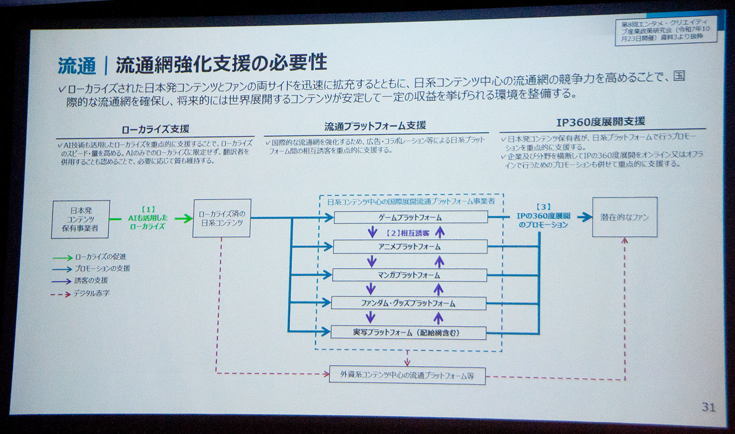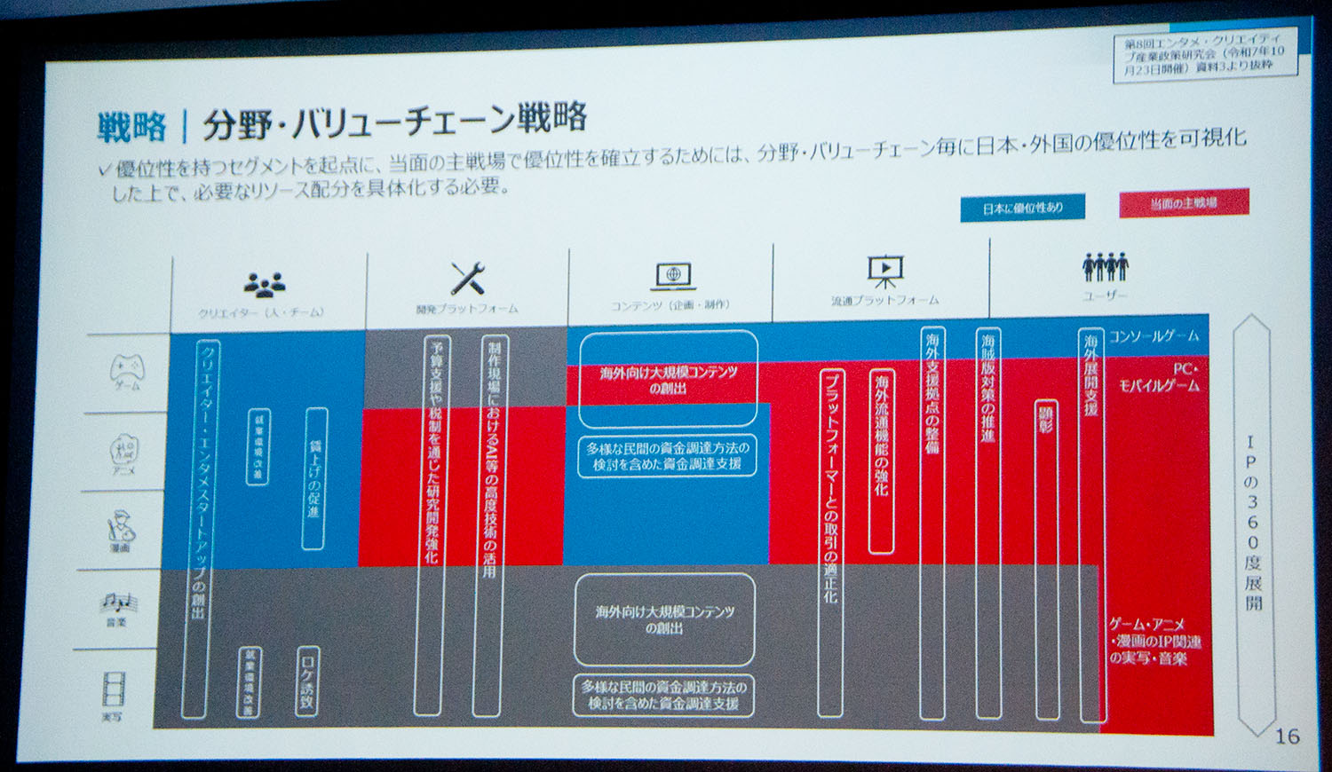 その上で、アニメから漫画、ゲーム、音楽へとIPを360度展開する総合力をさらに促進するべく、縦割りでない総合的な政策パッケージを構築すると語った。