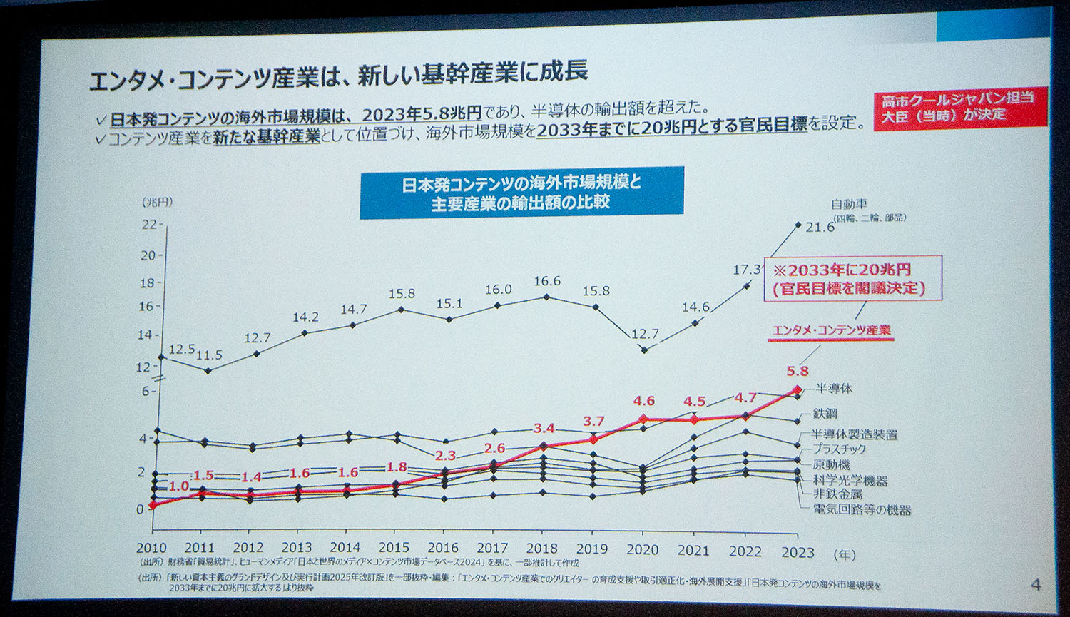 この力強い成長を背景に、政府は2024年、コンテンツ産業を新たな基幹産業と位置づけ、海外売上高を2033年までに、現在の自動車産業の輸出額に並ぶ20兆円規模へと拡大させる目標を閣議決定した。