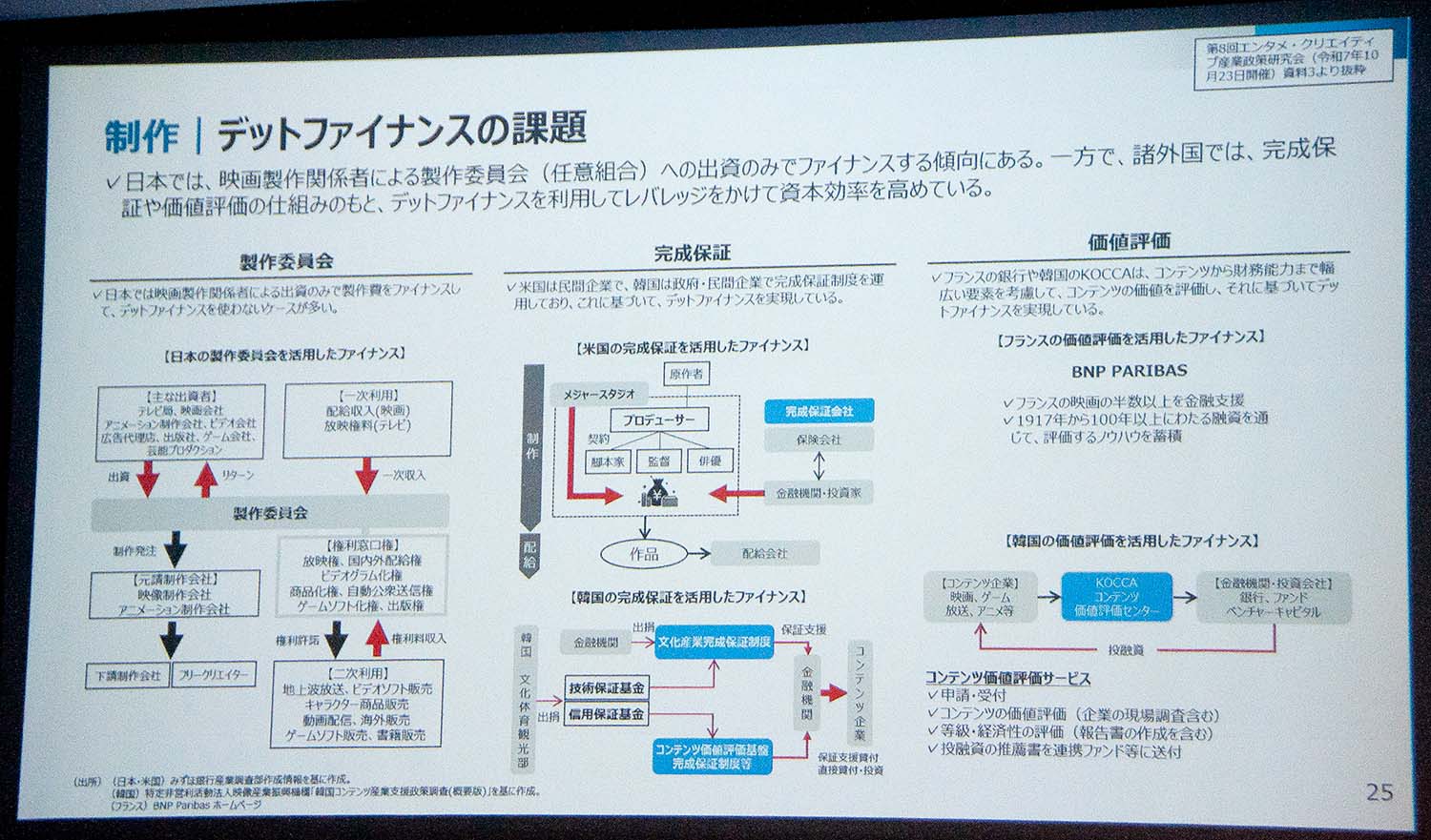コンテンツ制作の資金調達において、日本ではデット(負債)の活用が海外に比べ極めて少ないと指摘。米国の事例を参考に、今後は金融機関とも連携し、完成保証やギャップファイナンスといった多様な手法の導入を検討していくとした。