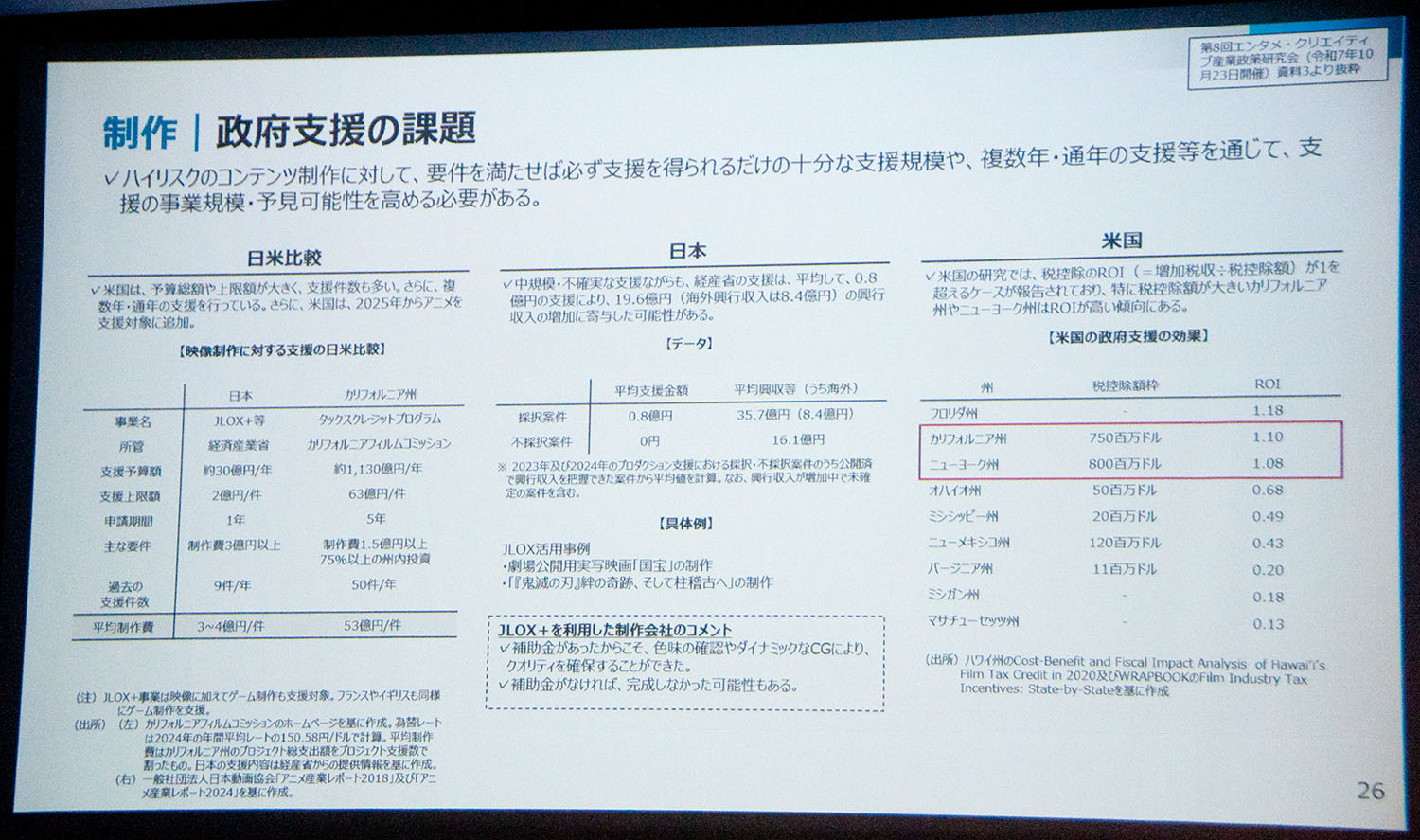 梶氏は、カリフォルニア州の映像制作支援体制に触れ、その規模が「日本と桁が違う」と表現。「政府支援はコストではなく、税収増にも繋がる『戦略投資』であるという発想の転換が必要だ」と訴えた。