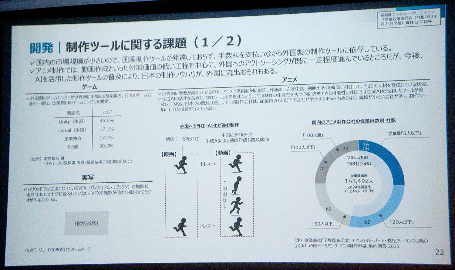また、米国製が主流となっているゲームエンジンや、多くを海外にアウトソースしているアニメの動画工程など、制作ツールに関する課題にも言及。AIなども活用した効率化と国内基盤強化が急務であるとの認識を示した。