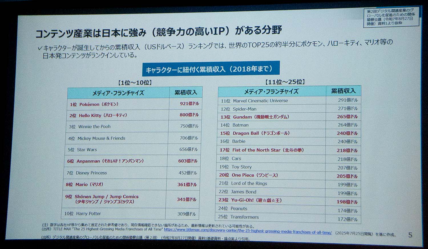 日本のコンテンツが持つ国際競争力について、梶氏は世界のIP(知的財産)収益ランキングを例に挙げ、累積収益トップ25の多くを日本のIPが占めている事実を紹介。一方で、その多くが2000年以前に創出されたIPであるとし、「新たなIPをどう作って世界に届けていくのかが課題だ」と指摘した。