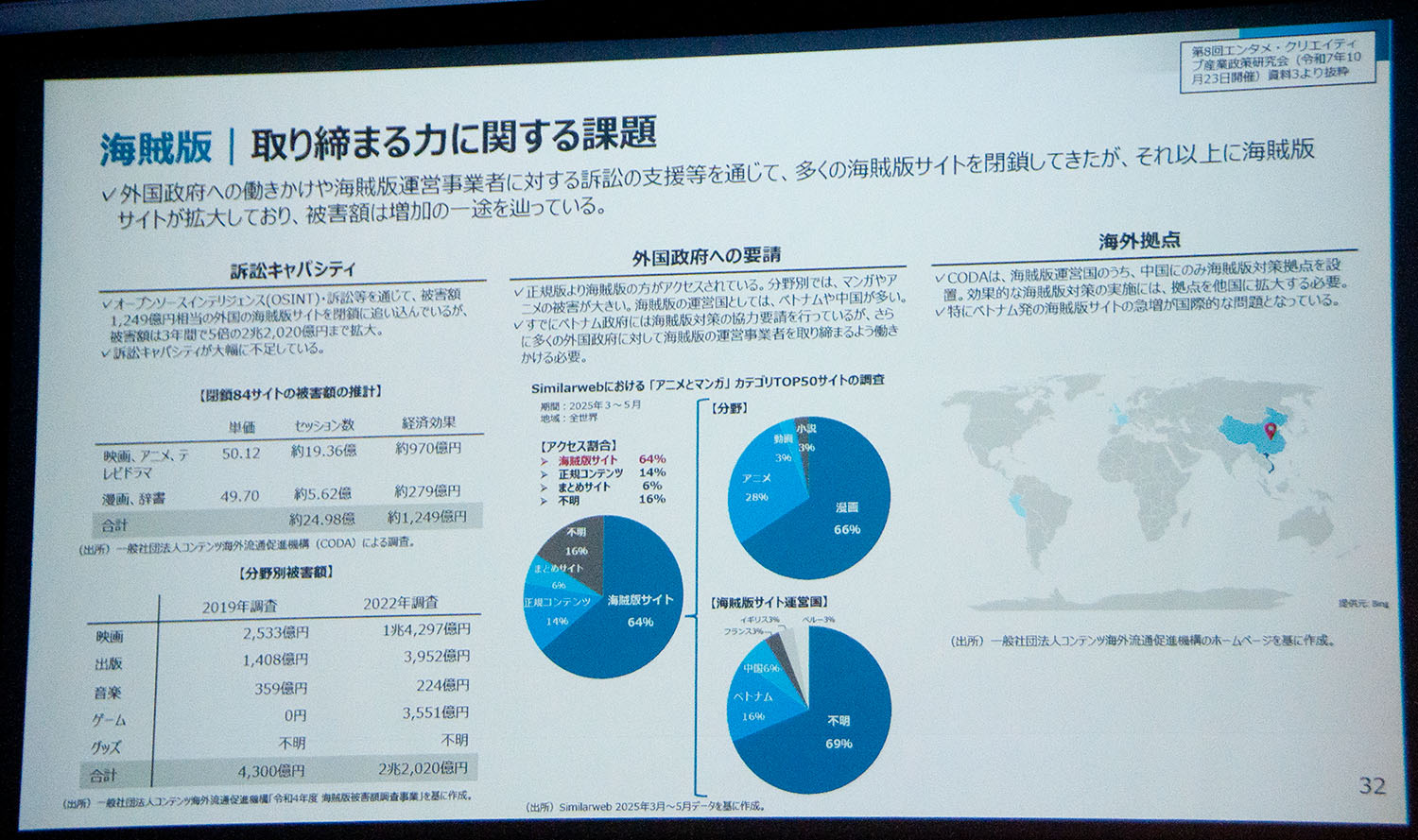 また、被害額が2兆円規模に上る海外での海賊版に対しては、現地政府と連携して取り締まりを強化すると同時に、正規版へのアクセスを容易にする「流通」をセットで進める「盾と矛」の戦略を強調。日本のコンテンツを理解し、戦略的に展開できる日系プラットフォームの連携・強化を支援していく方針を明らかにした。