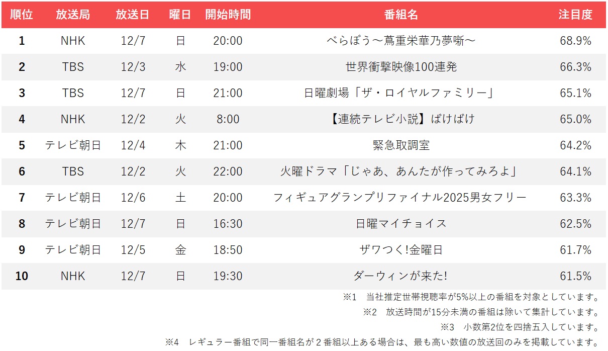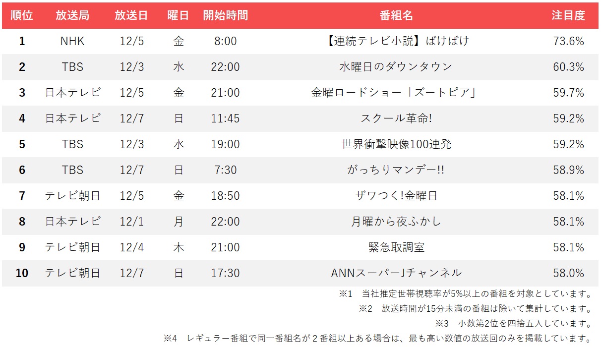12月第1週のランキングでは、年末ならではの強力な特番や話題作の映画放送が上位に食い込む結果となった。