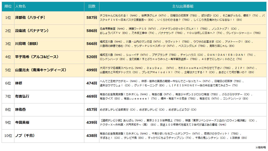 ■2025年TV番組出演ランキング(モデル・タレント・アイドル・音楽・その他)